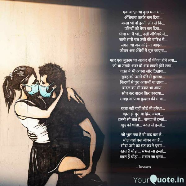рдПрдХ рдмрд╛рджрд▓ рдерд╛ рдХреБрдЫ рдШрдирд╛ рд╕рд╛...рдЕрдБрдзрд┐рдпрд╛рд░рд╛ рдХрд░рдХреЗ рдЪрд▓ рджрд┐рдпрд╛...рдмрд░рд╕рд╛ рднреА рд╡реЛ рдЗрддрдиреА рдЬрд╝реЛрд░ рд╕реЗ рдХрд┐...рдкрд░рд┐рдиреНрджреЛрдВ рдХреЛ рдмреЗрдШрд░ рдХрд░ рджрд┐рдпрд╛...рднреАрдЧрд╛ рдерд╛ рдореИрдВ рднреА... рдЙрд╕реА рдЕрдБрдзрд┐рдпрд╛рд░реЗ рдореЗрдВ...рд╕рд╛рд░реА рд╕рд╛рд░реА рд░рд╛рдд рдЙрд╕реА рдХреА рдмрд╛рд░рд┐рд╢ рдореЗрдВ...рд▓рдЧрддрд╛ рдерд╛ рдЕрдм рдХреЛрдИ рдирд╛ рдЖрдПрдЧрд╛...рдЬреАрд╡рди рдЕрдм рдЕрдБрдзреЗрд░реЛрдВ рдореЗрдВ рдШреБрд▓ рдЬрд╛рдПрдЧрд╛...рдордЧрд╝рд░ рдПрдХ рдореБрдХрд╝рд╛рдо рдкрд░ рдЖрдХрд░ рд╡реЛ рдлреАрдХрд╛ рд╣реЛрдиреЗ рд▓рдЧрд╛...рдЬреЛ рдерд╛ рдЙрд╕рдХреЗ рдЕрдВрджрд░ рд╡реЛ рдЕрдм рдЦрд╛рд▓реА... Continue Reading →