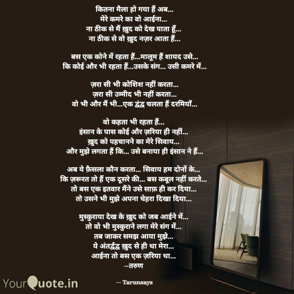 рдХрд┐рддрдирд╛ рдореИрд▓рд╛ рд╣реЛ рдЧрдпрд╛ рд╣реИрдВ рдЕрдм...рдореЗрд░реЗ рдХрдорд░реЗ рдХрд╛ рд╡реЛ рдЖрдИрдирд╛... рдирд╛ рдареАрдХ рд╕реЗ рдореИрдВ рдЦрд╝реБрдж рдХреЛ рджреЗрдЦ рдкрд╛рддрд╛ рд╣реВрдБ... рдирд╛ рдареАрдХ рд╕реЗ рд╡реЛ рдЦрд╝реБрдж рдирдЬрд╝рд░ рдЖрддрд╛ рд╣реИрдВ...рдмрд╕ рдПрдХ рдХреЛрдиреЗ рдореЗрдВ рд░рд╣рддрд╛ рд╣реИрдВ...рдорд╛рд▓реВрдо рд╣реИрдВ рд╢рд╛рдпрдж рдЙрд╕реЗ...рдХрд┐ рдХреЛрдИ рдФрд░ рднреА рд░рд╣рддрд╛ рд╣реИрдВ...рдЙрд╕рдХреЗ рд╕рдВрдЧ... рдЙрд╕реА рдХрдорд░реЗ рдореЗрдВ...рдЬрд╝рд░рд╛ рд╕реА рднреА рдХреЛрд╢рд┐рд╢ рдирд╣реАрдВ рдХрд░рддрд╛...рдЬрд╝рд░рд╛ рд╕реА рдЙрдореНрдореАрдж рднреА рдирд╣реАрдВ рдХрд░рддрд╛...рд╡реЛ рднреА... Continue Reading →