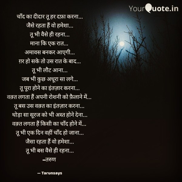 рдЪрд╛рдБрдж рдХрд╛ рджреАрджрд╛рд░ рддреВ рд╣рд░ рджрдлрд╝рд╛ рдХрд░рдирд╛...рдЬреИрд╕реЗ рд░рд╣рддрд╛ рд╣реИрдВ рд╡реЛ рд╣рдореЗрд╢рд╛...рддреВ рднреА рд╡реИрд╕реЗ рд╣реА рд░рд╣рдирд╛...рдорд╛рдирд╛ рдХрд┐ рдПрдХ рд░рд╛рдд... рдЕрдорд╛рд╡рд╕ рдмрдирдХрд░ рдЖрдПрдЧреА...рдЧрд╝рд░ рд╣реЛ рд╕рдХреЗ рддреЛ рдЙрд╕ рд░рд╛рдд рдХреЗ рдмрд╛рдж...рддреВ рднреА рд▓реМрдЯ рдЖрдирд╛...рдЬрдм рднреА рдХреБрдЫ рдЕрдзреВрд░рд╛ рд╕рд╛ рд▓рдЧреЗ...рддреВ рдкреВрд░рд╛ рд╣реЛрдиреЗ рдХрд╛ рдЗрдВрддрдЬрд╝рд╛рд░ рдХрд░рдирд╛...рд╡рдХрд╝реНрдд рд▓рдЧрддрд╛ рд╣реИрдВ рдЕрдкрдиреА рд░реЛрд╢рдиреА рдХреЛ рдлрд╝реИрд▓рд╛рдиреЗ рдореЗрдВ... рддреВ рдмрд╕ рдЙрд╕ рд╡рдХрд╝реНрдд рдХрд╛ рдЗрдВрддрдЬрд╝рд╛рд░ рдХрд░рдирд╛...... Continue Reading →